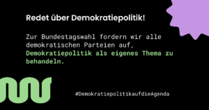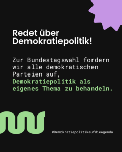 29 zivilgesellschaftliche Organisationen fordern alle demokratischen Parteien auf, bereits in ihren Wahlprogrammen und dann in Koalitionsverhandlungen Demokratiepolitik als eigenes Thema zu behandeln, idealerweise in einem eigenen Kapitel (und einer eigenen Arbeitsgruppe), statt die damit zusammenhängenden Themen verteilt auf einzelne klassische Ressorts zu behandeln. Themen, die gebündelt werden müssen, sind unter anderem: