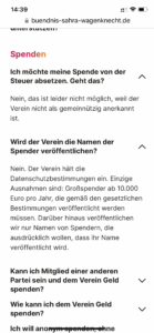 Der Verein „BSW – Für Vernunft und Gerechtigkeit e.V.“ ist nach eigener Auskunft nicht gemeinnützig und strebt das offenbar auch nicht an. Stattdessen unterwirft er sich freiwillig (ohne dies zu erläutern) den Spendenregeln der Parteien (Offenlegung ab 10.000 Euro, Annahmeverbote, § 25 Parteiengesetz).