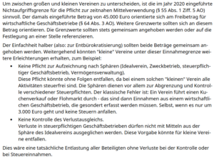 Erzielen gemeinnützige Körperschaften aus wirtschaftlichen Tätigkeiten weniger als 50.000 Euro Einnahmen im Jahr, muss keine Sphärenaufteilung mehr erfolgen, ob diese Einnahmen aus einem Zweckbetrieb oder aus einem steuerpflichtigen wirtschaftlichen Geschäftsbetrieb stammen.