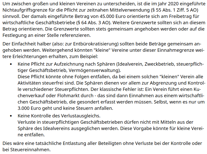 Die AG Finanzen will Freigrenzen im Gemeinnützigkeitsrecht harmonisieren, kleine Vereine von der Sphären-Trennung ausnehmen und mittelgroße Vereine von der zeitnahen Mittelverwendung. Genau dazu hatten wir im Dezember 2024 einen Impuls anlässlich eines CDU/CSU-Antrags gegeben, der sich hier wiederzufinden scheint. Eine vor neun Monaten geplante komplette Streichung des Gebots der zeitnahen Mittelverwendung hätte vielleicht ein paar Vereine, aber vor allem die Finanzverwaltung entlastet – und hätte zugleich einen Glaubwürdigkeitsschaden für gemeinnützige Organisationen produzieren können.