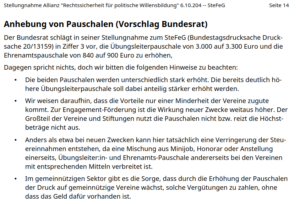 Daher schaffen wir einen ‚Zukunftspakt Ehrenamt‘. In diesem werden wir die Ehrenamts- und Übungsleiterpauschale zu einer ‚Gemeinwohlpauschale‘ zusammenführen und erhöhen.