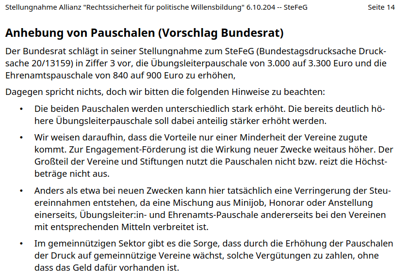 Dann und wann wird geschrieben, der Status der Gemeinnützigkeit biete steuerliche Vorteile für die Organisationen. Das ist fast falsch. Steuervorteile haben einige Spender:innen. Bei Zweckbetrieben kann es Vorteile geben – die meisten Vereine haben keinen Zweckbetrieb. Was tatsächlich Steuergeld kostet, sind die Ehrenamts- und Übungsleiter:innen-Pauschale. Natürlich wollen die drei Parteien diese erhöhen.