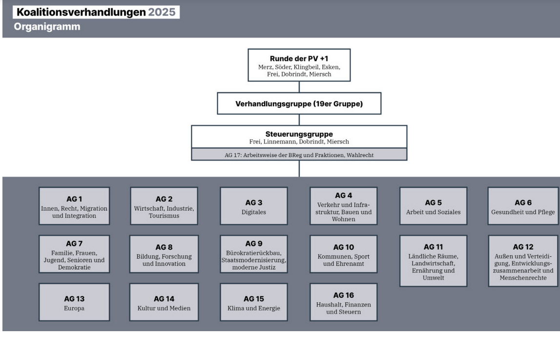 Update: Die Arbeitsgruppen-Ergebnisse wurden weitgehend so (auch so unsortiert) in den Koalitionsvertrag übernommen.