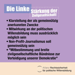 Das Gemeinnützigkeitsrecht wird vereinfacht. Der Katalog der gemeinnützigen Zwecke wird modernisiert. Wenn die Ergebnisse aus den Arbeitsgruppen der Koalitionsverhandlungen von CDU, SPD und CSU so in den Vertrag kommen, gäbe es erneut große Chancen für ein zeitgemäßes Gemeinnützigkeitsrecht zur Förderung von Demokratie und Rechtsstaatlichkeit. Am 24. März 2025 sollten die 17 Arbeitsgruppen zu den Koalitionsverhandlungen von CDU, SPD, CSU ihre Arbeit abschließen und ihre Berichte mit Einigungen an die Steuerungsgruppe übergeben. Im Laufe der Woche wurden diese Berichte öffentlich – und zeigen zur Modernisierung des Gemeinnützigkeitsrechts überraschend positive Vorhaben.