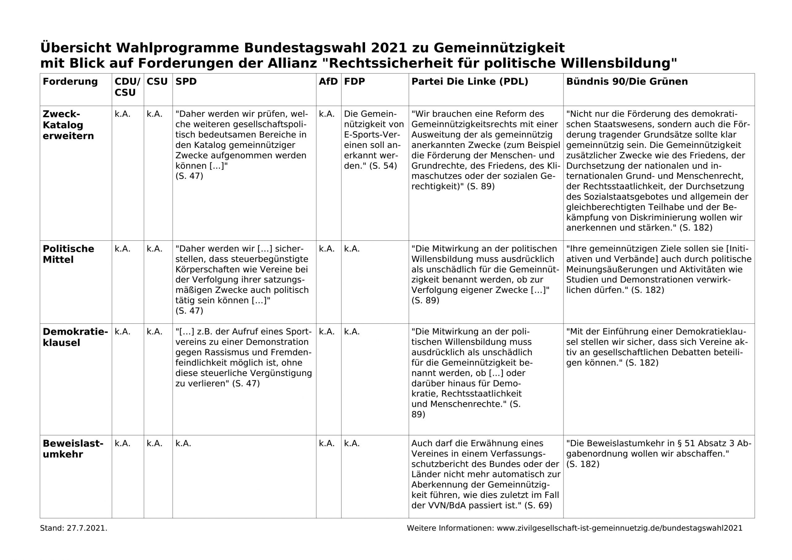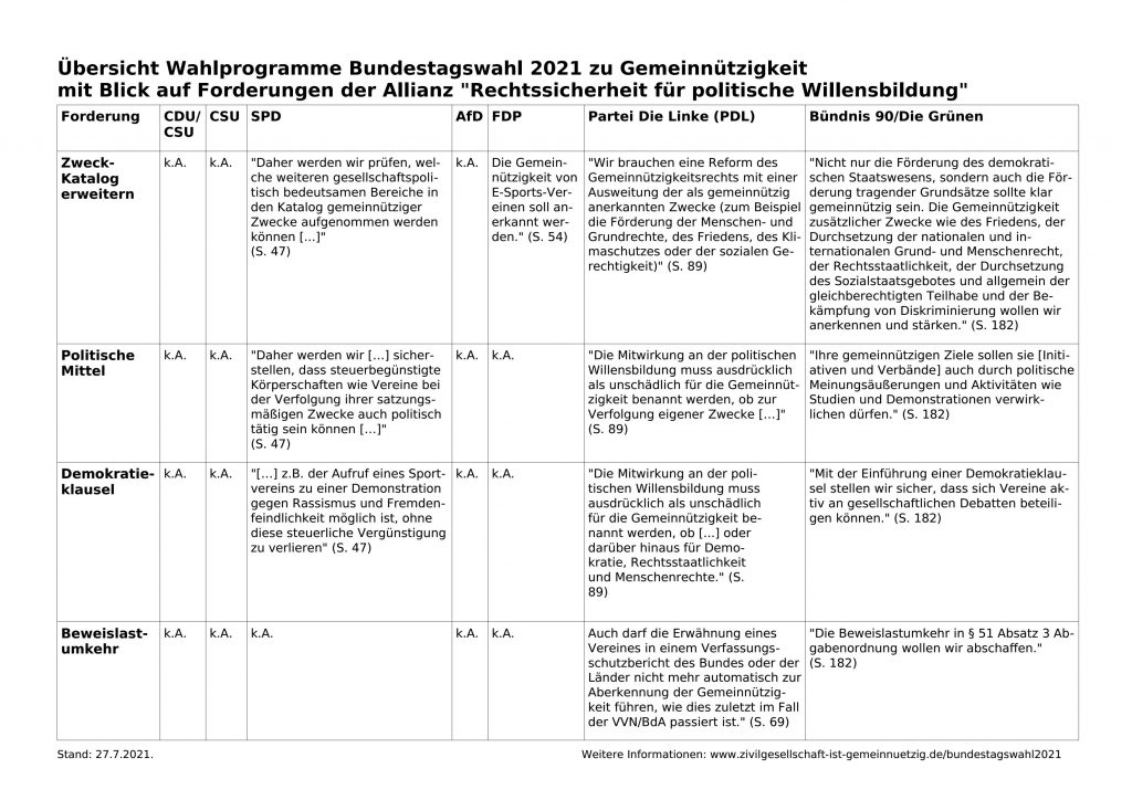 Jura-Professor Sebastian Unger erklärte Ende Juni 2021 im Interview mit der „Zeit“, wie politisch gemeinnützige Vereine sein dürften. Politisches Engagement nur in Parteien zu verorten, sei „ein zu enges Verständnis von Demokratie“. Es brauche auch eine politisch aktive Zivilgesellschaft jenseits von Parteien. Nur, weil ein Verein politische Forderungen zu seinen gemeinnützigen Zwecken habe, könne er noch lange keine Partei sein. „Parteien wollen nicht nur ihre Meinung sagen, sie streben auch nach staatlicher Macht und wollen gewählt werden“, beschreibt Unger den Unterschied.