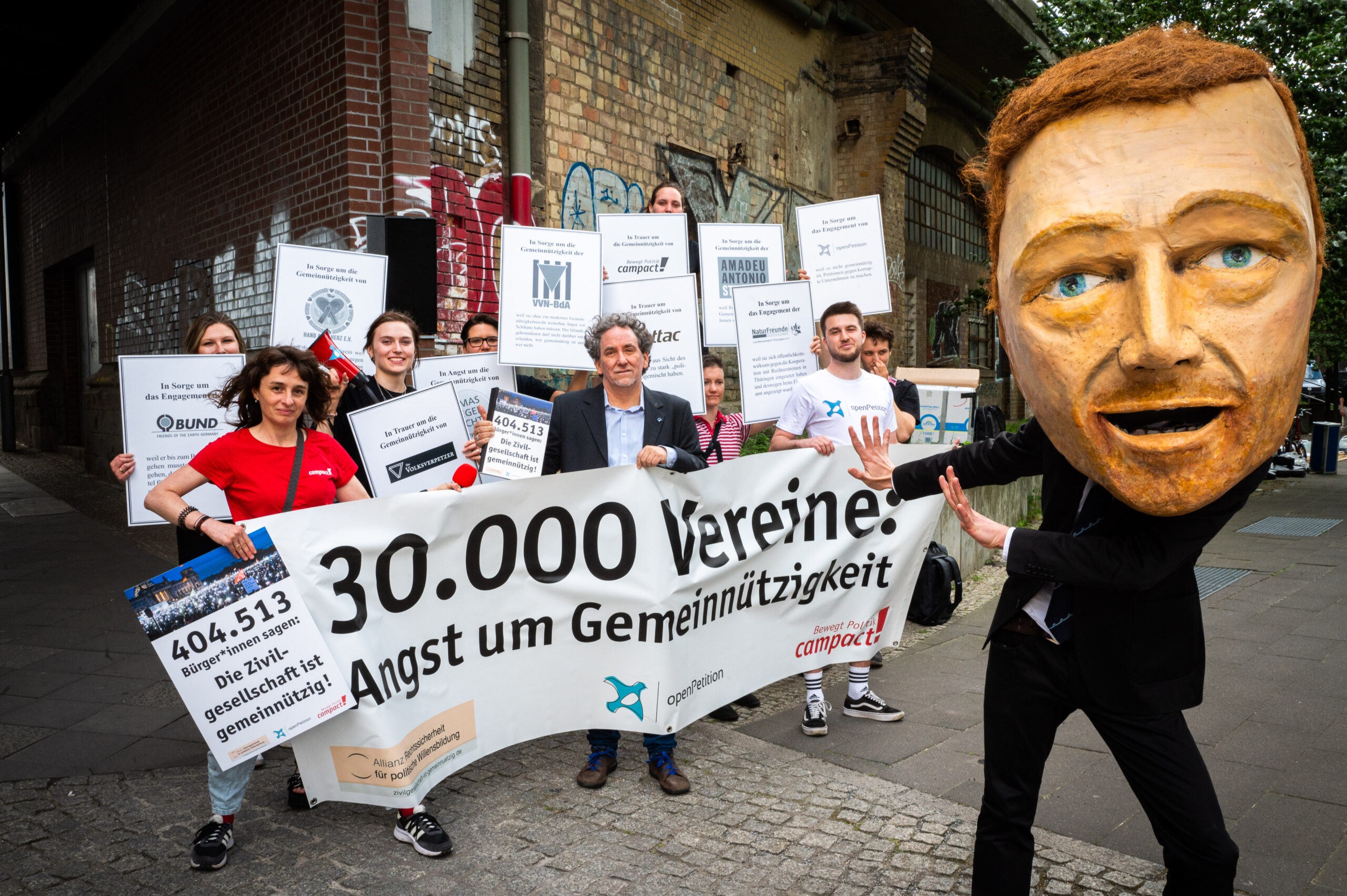 Auch dabei war ein großes Banner mit der Aufschrift: 30.000 Vereine: Angst um Gemeinnützigkeit, in Anlehnung an den ZiviZ-Survey aus 2023, demnach fünf Prozent aller gemeinnützigen Vereine in Deutschland sich selber aus Angst um ihren steuerbegünstigten Status zensieren.